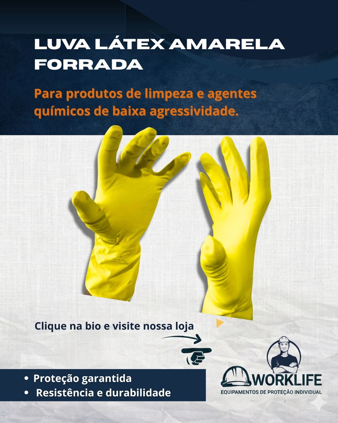 A Luva de Látex Amarela Forrada WorkLife é ideal para proteger as mãos em atividades que envolvem água, produtos de limpeza e agentes químicos leves, garantindo mais segurança e praticidade no trabalho.
