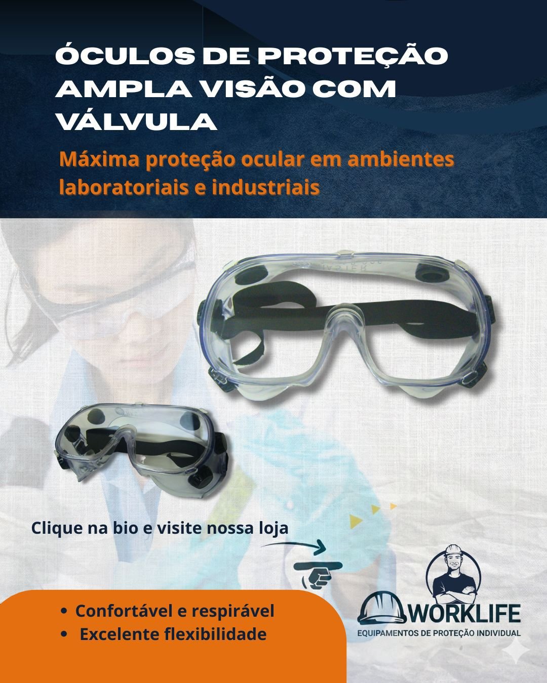O *Óculos de Proteção Ampla Visão WorkLife* foi desenvolvido para garantir *máxima proteção ocular em ambientes laboratoriais e industriais*, protegendo contra respingos de líquidos, partículas e agentes externos.